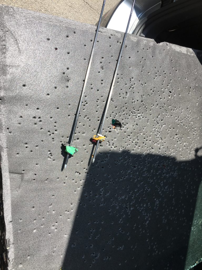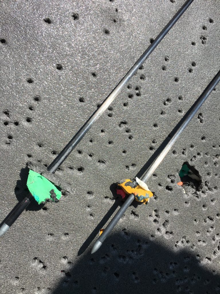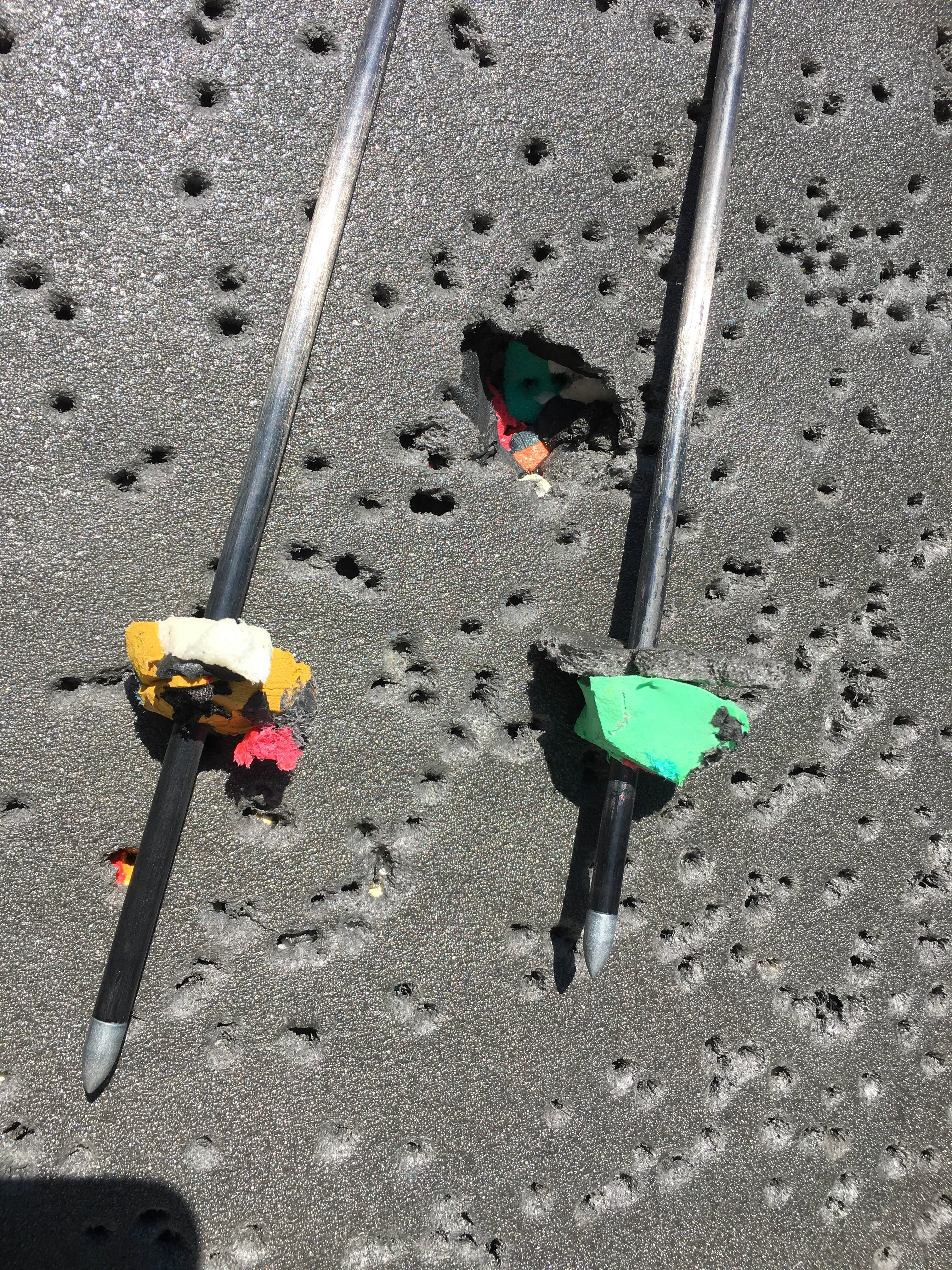 Recycelte Schaumstoffflocken sind die Bestandteile dieser Scheibenmatte. Wie man auf den Bildern erkennt ist sie nicht zum Bogenschießen geeignet. Bei vielen Treffern reißt man die Flocken mit raus. Achtung vor solchen Zielen.
